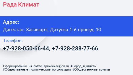 Рада Климат по адресу Дагестан, Хасавюрт, Датуева 1-й проезд, 10 в дальнейшем Организация, размещена в следующих категориях: