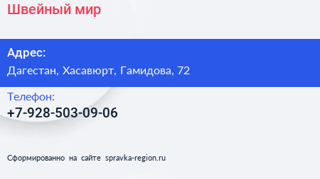 Швейный мир по адресу Дагестан, Хасавюрт, Гамидова, 72 в дальнейшем Организация, размещена в следующих категориях: