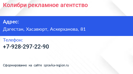 Колибри, рекламное агентство по адресу Дагестан, Хасавюрт, Аскерханова, 81 в дальнейшем Организация, размещена в следующих категориях: