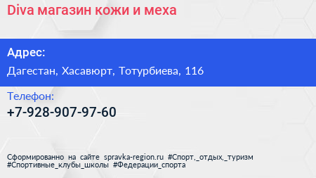 Diva, магазин кожи и меха по адресу Дагестан, Хасавюрт, Тотурбиева, 116 в дальнейшем Организация, размещена в следующих категориях: