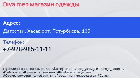 Diva men, магазин одежды по адресу Дагестан, Хасавюрт, Тотурбиева, 135 в дальнейшем Организация, размещена в следующих категориях:
