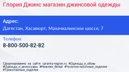 Глория Джинс, магазин джинсовой одежды по адресу Дагестан, Хасавюрт, Махачкалинское шоссе, 7 в дальнейшем Организация, размещена в следующих категориях: