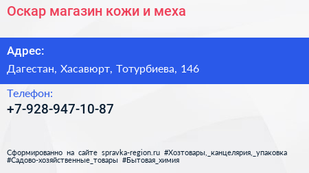 Оскар, магазин кожи и меха по адресу Дагестан, Хасавюрт, Тотурбиева, 146 в дальнейшем Организация, размещена в следующих категориях: