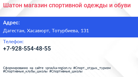 Шатон, магазин спортивной одежды и обуви по адресу Дагестан, Хасавюрт, Тотурбиева, 131 в дальнейшем Организация, размещена в следующих категориях: