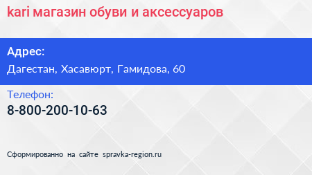 kari, магазин обуви и аксессуаров по адресу Дагестан, Хасавюрт, Гамидова, 60 в дальнейшем Организация, размещена в следующих категориях:
