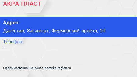 АКРА-ПЛАСТ по адресу Дагестан, Хасавюрт, Фермерский проезд, 14 в дальнейшем Организация, размещена в следующих категориях: