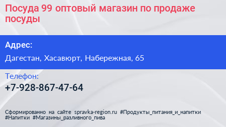 Посуда 99, оптовый магазин по продаже посуды по адресу Дагестан, Хасавюрт, Набережная, 65 в дальнейшем Организация, размещена в следующих категориях: