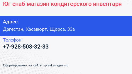 Юг-снаб, магазин кондитерского инвентаря по адресу Дагестан, Хасавюрт, Щорса, 33а в дальнейшем Организация, размещена в следующих категориях: