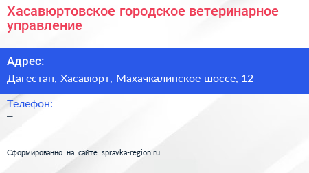 Хасавюртовское городское ветеринарное управление по адресу Дагестан, Хасавюрт, Махачкалинское шоссе, 12 в дальнейшем Организация, размещена в следующих категориях: