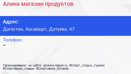 Алина, магазин продуктов по адресу Дагестан, Хасавюрт, Датуева, 47 в дальнейшем Организация, размещена в следующих категориях: