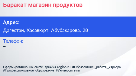 Баракат, магазин продуктов по адресу Дагестан, Хасавюрт, Абубакарова, 28 в дальнейшем Организация, размещена в следующих категориях: