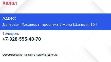 Халал по адресу Дагестан, Хасавюрт, проспект Имама Шамиля, 164 в дальнейшем Организация, размещена в следующих категориях: