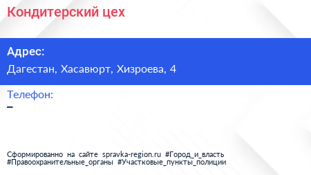 Кондитерский цех по адресу Дагестан, Хасавюрт, Хизроева, 4 в дальнейшем Организация, размещена в следующих категориях: