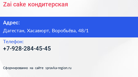 Zai cake, кондитерская по адресу Дагестан, Хасавюрт, Воробьёва, 48/1 в дальнейшем Организация, размещена в следующих категориях: