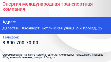 Энергия, международная транспортная компания по адресу Дагестан, Хасавюрт, Бетлинская улица 2-й проезд, 22 в дальнейшем Организация, размещена в следующих категориях: