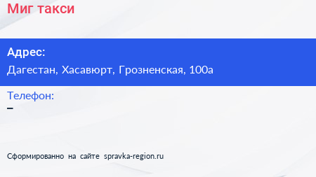 Миг, такси по адресу Дагестан, Хасавюрт, Грозненская, 100а в дальнейшем Организация, размещена в следующих категориях: