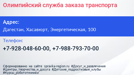 Олимпийский, служба заказа транспорта по адресу Дагестан, Хасавюрт, Энергетическая, 100 в дальнейшем Организация, размещена в следующих категориях: