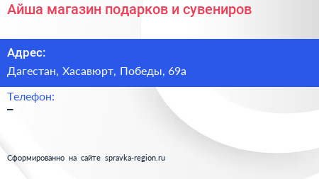 Айша, магазин подарков и сувениров по адресу Дагестан, Хасавюрт, Победы, 69а в дальнейшем Организация, размещена в следующих категориях: