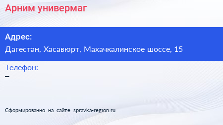 Арним, универмаг по адресу Дагестан, Хасавюрт, Махачкалинское шоссе, 15 в дальнейшем Организация, размещена в следующих категориях: