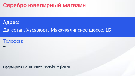 Серебро, ювелирный магазин по адресу Дагестан, Хасавюрт, Махачкалинское шоссе, 1Б в дальнейшем Организация, размещена в следующих категориях: