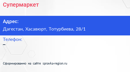 Супермаркет по адресу Дагестан, Хасавюрт, Тотурбиева, 28/1 в дальнейшем Организация, размещена в следующих категориях: