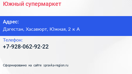 Южный, супермаркет по адресу Дагестан, Хасавюрт, Южная, 2 к А в дальнейшем Организация, размещена в следующих категориях: