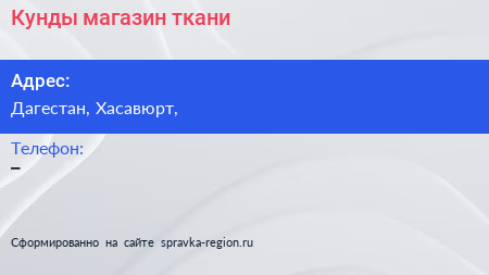 Кунды, магазин ткани по адресу Дагестан, Хасавюрт, в дальнейшем Организация, размещена в следующих категориях: