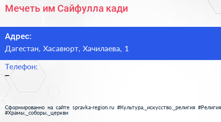 Мечеть им. Сайфулла-кади по адресу Дагестан, Хасавюрт, Хачилаева, 1 в дальнейшем Организация, размещена в следующих категориях: