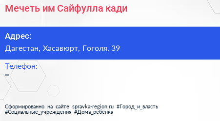 Мечеть им. Сайфулла-кади по адресу Дагестан, Хасавюрт, Гоголя, 39 в дальнейшем Организация, размещена в следующих категориях: