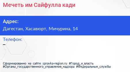 Мечеть им. Сайфулла-кади по адресу Дагестан, Хасавюрт, Мичурина, 14 в дальнейшем Организация, размещена в следующих категориях: