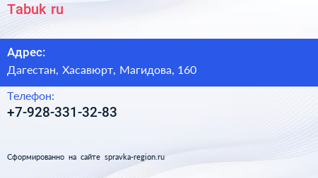 Tabuk.ru по адресу Дагестан, Хасавюрт, Магидова, 160 в дальнейшем Организация, размещена в следующих категориях: