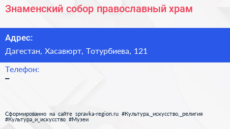 Знаменский собор, православный храм по адресу Дагестан, Хасавюрт, Тотурбиева, 121 в дальнейшем Организация, размещена в следующих категориях: