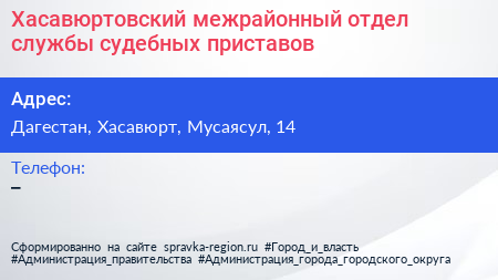 Хасавюртовский межрайонный отдел службы судебных приставов по адресу Дагестан, Хасавюрт, Мусаясул, 14 в дальнейшем Организация, размещена в следующих категориях: