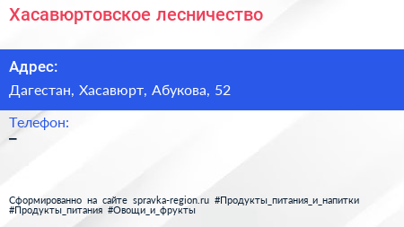 Хасавюртовское лесничество по адресу Дагестан, Хасавюрт, Абукова, 52 в дальнейшем Организация, размещена в следующих категориях: