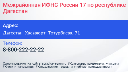 Межрайонная ИФНС России №17 по республике Дагестан по адресу Дагестан, Хасавюрт, Тотурбиева, 71 в дальнейшем Организация, размещена в следующих категориях: