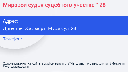 Мировой судья судебного участка №128 по адресу Дагестан, Хасавюрт, Мусаясул, 28 в дальнейшем Организация, размещена в следующих категориях:
