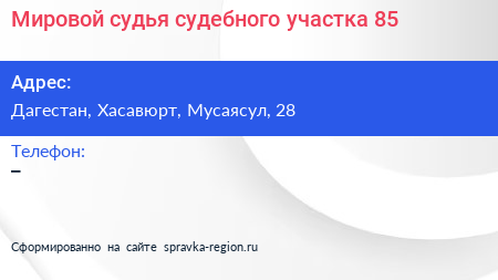 Мировой судья судебного участка №85 по адресу Дагестан, Хасавюрт, Мусаясул, 28 в дальнейшем Организация, размещена в следующих категориях: