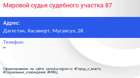 Мировой судья судебного участка №87 по адресу Дагестан, Хасавюрт, Мусаясул, 28 в дальнейшем Организация, размещена в следующих категориях: