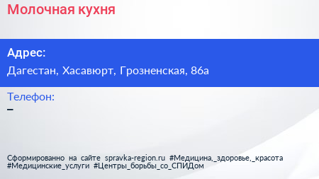 Молочная кухня по адресу Дагестан, Хасавюрт, Грозненская, 86а в дальнейшем Организация, размещена в следующих категориях: