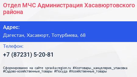 Отдел МЧС, Администрация Хасавюртовского района по адресу Дагестан, Хасавюрт, Тотурбиева, 68 в дальнейшем Организация, размещена в следующих категориях: