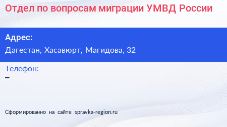 Отдел по вопросам миграции УМВД России по адресу Дагестан, Хасавюрт, Магидова, 32 в дальнейшем Организация, размещена в следующих категориях: