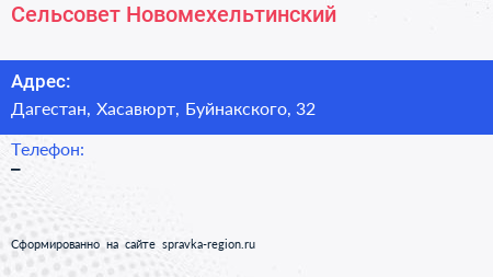 Сельсовет Новомехельтинский по адресу Дагестан, Хасавюрт, Буйнакского, 32 в дальнейшем Организация, размещена в следующих категориях: