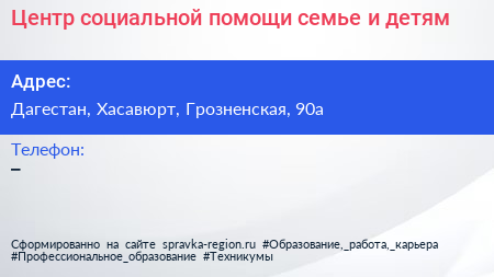 Центр социальной помощи семье и детям по адресу Дагестан, Хасавюрт, Грозненская, 90а в дальнейшем Организация, размещена в следующих категориях: