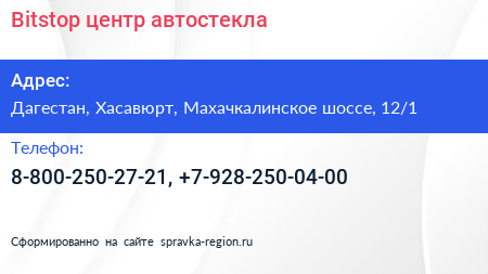 Bitstop, центр автостекла по адресу Дагестан, Хасавюрт, Махачкалинское шоссе, 12/1 в дальнейшем Организация, размещена в следующих категориях: