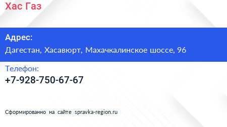 Xac-Газ по адресу Дагестан, Хасавюрт, Махачкалинское шоссе, 96 в дальнейшем Организация, размещена в следующих категориях: