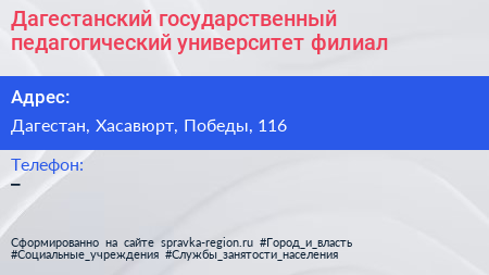 Дагестанский государственный педагогический университет, филиал по адресу Дагестан, Хасавюрт, Победы, 116 в дальнейшем Организация, размещена в следующих категориях: