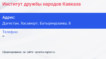 Институт дружбы народов Кавказа по адресу Дагестан, Хасавюрт, Батырмурзаева, 8 в дальнейшем Организация, размещена в следующих категориях: