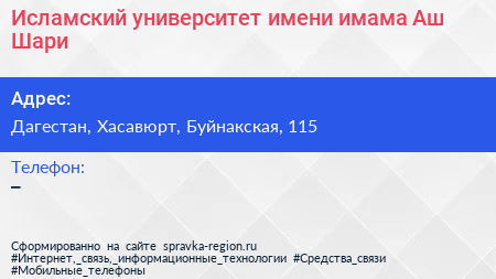 Исламский университет имени имама Аш-Шари по адресу Дагестан, Хасавюрт, Буйнакская, 115 в дальнейшем Организация, размещена в следующих категориях:
