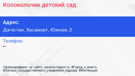 Колокольчик, детский сад по адресу Дагестан, Хасавюрт, Южная, 2 в дальнейшем Организация, размещена в следующих категориях: