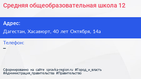 Средняя общеобразовательная школа №12 по адресу Дагестан, Хасавюрт, 40 лет Октября, 14а в дальнейшем Организация, размещена в следующих категориях: